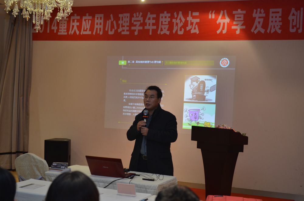 【本网讯】2014年12月28日由中国人生科学学会心理学专业委员会举办的“2014年重庆应用心理学年度论坛”在渝召开。各位专家围绕“分享、发展、创新”主题展开了研讨。我校参会代表以《基于高校组织管理心理学视角分析》为题目与大家分享和探讨了心理学在高校管理应用中的经验。出席本次论坛的还有西南大学心理学应用系主任杨东教授,重庆品跃教育咨询有限公司总经理黄婷婷女士等,他们分别从EAP(心理服务)在组织管理中的应用和心理意象在生活中的应用等诸多方面分享了自己的经验。