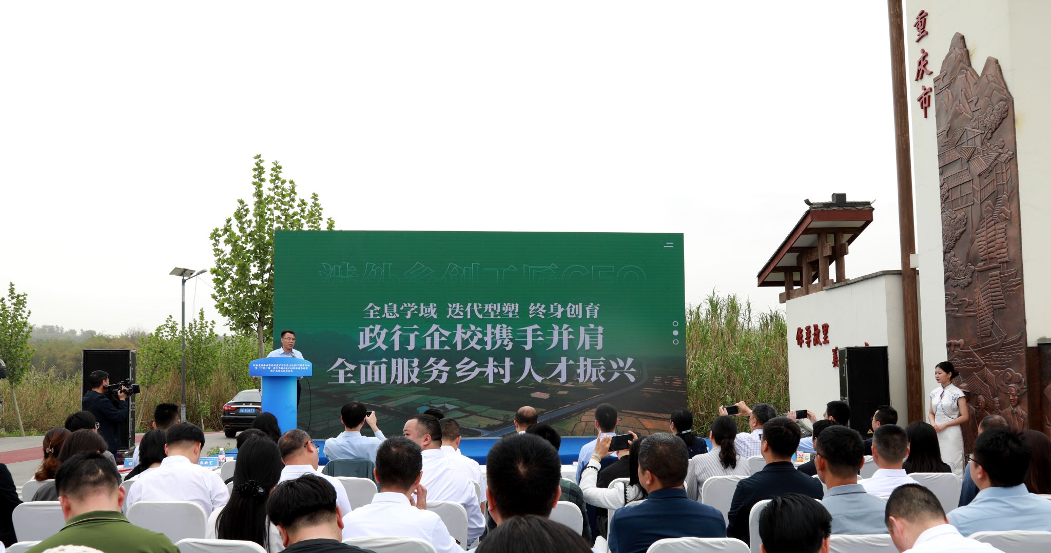 活动仪式在庄重的作孚先生主题浮雕广场正式开启。合川区委常委、组织部部长裴煜宇在致辞中着重强调,卢作孚先生的精神对当代创新创业有着极为深刻的激励价值,而 “一带一路” 涉外乡创无疑是推动乡村振兴、促进国际交流合作的关键途径。重庆对外经贸学院副校长周明星教授随后发言,详细阐述了高校在涉外乡创工匠 CEO 人才培养方面的积极探索与实践经验,充分彰显了高校在服务乡村振兴战略中的担当作为。