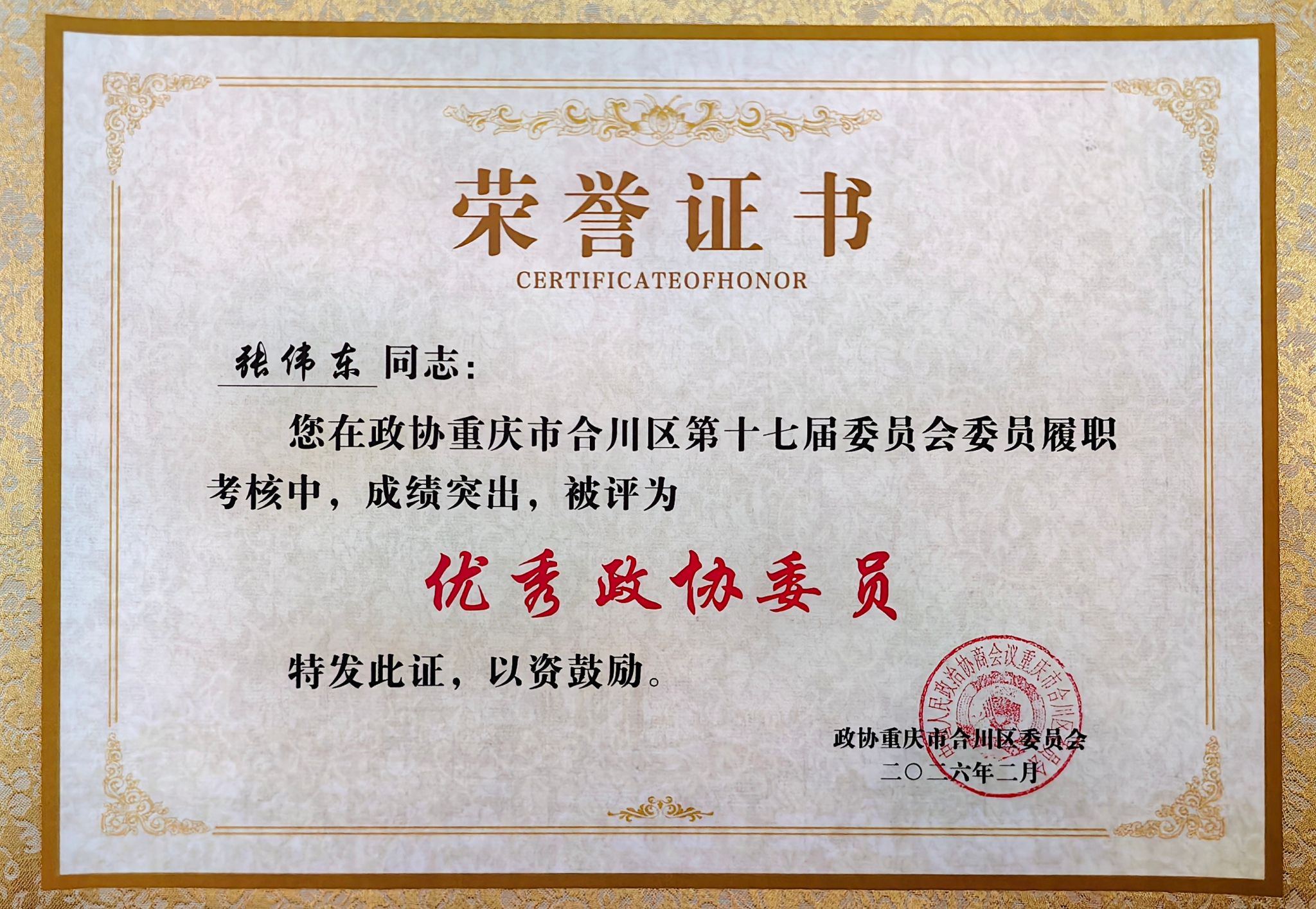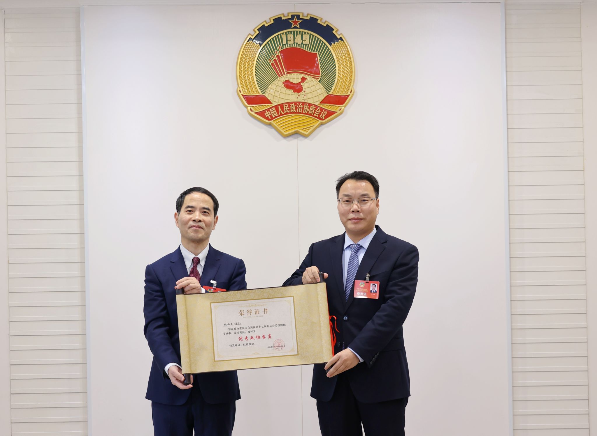 重庆市合川区政协主席叶华为张伟东院长颁发优秀政协委员证书