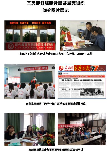 为进一步推进支部创新型基层党组织成果转化,推动群众路线教育实践和“三严三实”影响范围向基层工作岗位延伸,利用好“两学一做”学习教育载体,支部党员凝心聚力,以学校“两转”战略布局工作为核心,全员努力教育实践,全心工作以服促教,着力构建“党建引领,行政为基;岗位双责,服务发展”的工作路径。支部有关服务型先进事迹曾被《人民网》、《重庆日报》、《12371党建平台》和《合川日报》等中央和地方权威媒体给予报道。现汇报如下: