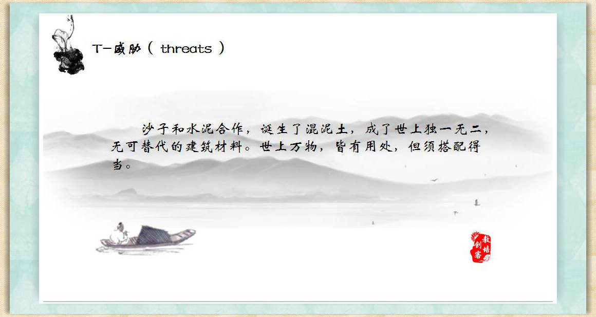 4.T-威胁( threats ):我以为校内培训市场和创新创业工作的资源至少目前还存在明显的“供给册”矛盾,各部门在协调、整合方面还没有明确的归口“时间表”,但是我总认为以上工作就像沙子一样,如果没有很好的协调、配合就是一盘散沙,只有把沙子通过水泥融合,才能诞生混凝土,成为世上独一无二,无可替代的建筑材料。世上万物,皆有用处,但须运用得当。