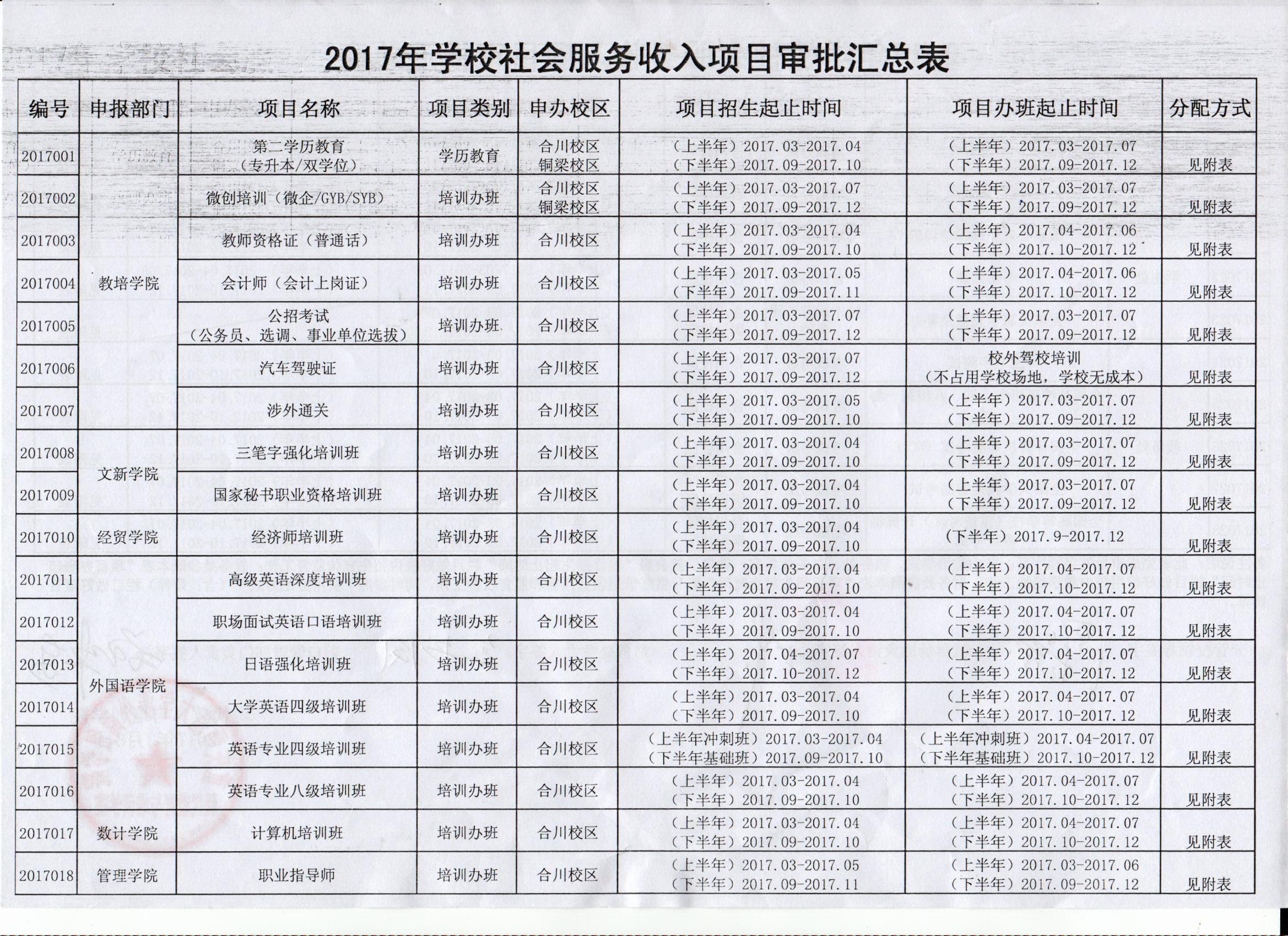 2017年各类办班考试项目公示表