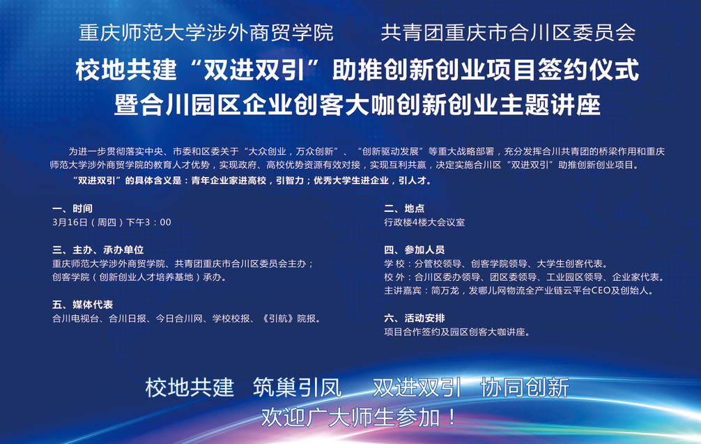 4.由团区委副书记赵艳龙和重庆师范大学涉外商贸学院教务处处长兼创客学院副院长彭成签署合作协议;