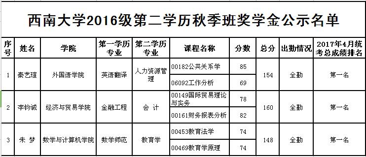 根据我校《第二学历专业班级管理规定》文件精神,结合2017年4月高等教育自学考试统考成绩情况,经过学院奖学金评定领导小组审定,确定了2016级第二学历秋季班奖学金评选名单,现将评选名单公示如下,公示时间为一个工作日。