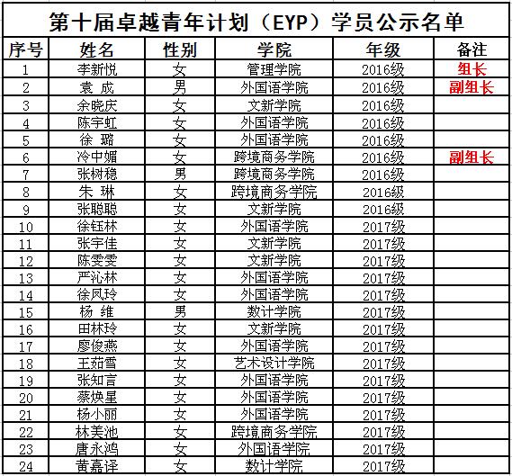 根据实际工作的需要,我院成立了第九届卓越青年计划(EYP)选拔领导小组,面向我院合川、铜梁校区学生组织面试选拔,经组织研究决定,现将第十届卓越青年计划(EYP)学员名单公示如下: