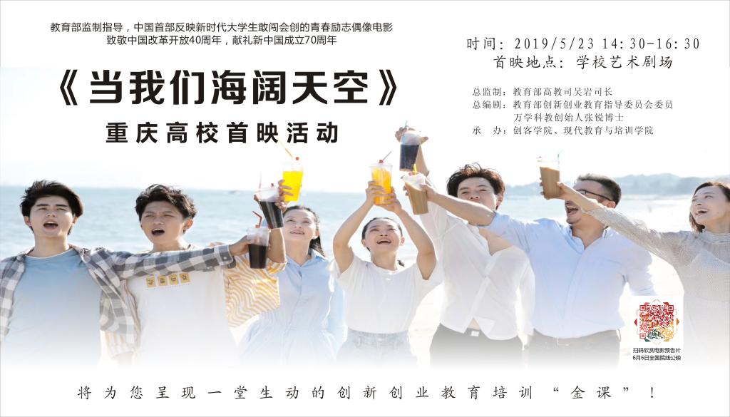 由教育部高教司监制指导,反映新时代青年大学生敢闯会创的青春励志奋斗偶像电影《当我们海阔天空》将于2019年6月6日在全国院线上映。经我校创新创业部门向上级有关主管部门积极争取,在影片出品方的大力支持下,决定重庆高校首映活动放在我校举办,这充分说明我校在创新创业教育方面的影响力和示范性。我校广大同学可以在提前全国院线上映前就可以在本校艺术剧场一饱这部青春励志偶像剧的眼福,朋友圈分享你的观影感受,无论对于学校办学声誉还是对于你个人成长都意义特殊。