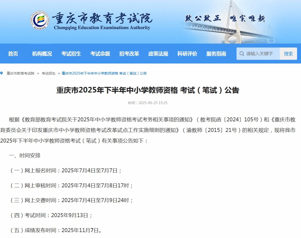 重庆市2025年下半年中小学教师资格 考试(笔试)公告 https://www.cqksy.cn/web/article/2025-06/25/content_6646.html
