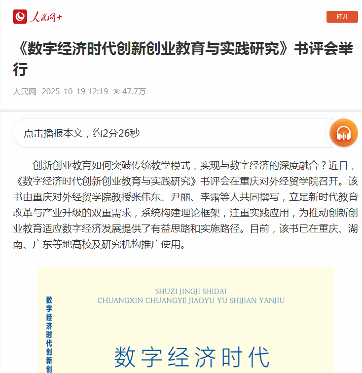 人民网报道《数字经济时代创新创业教育与实践研究》书评会举行
